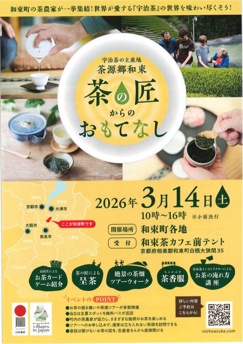 開催日:2026年3月14日(土) 10:00〜16:00(小雨決行)会場:京都府相楽郡和束町 各地 宇治茶の主産地として知られる「茶源郷・和束」。新緑が美しい春の和束で、茶農家が一堂に会する特別なイベントを開催します。普段は入れない茶畑のツアーや、茶の匠... -